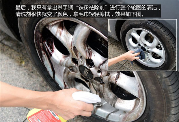 很驚訝鐵粉祛除劑能這么給力,而且全程操作很輕松,只需噴灑至輪圈表面,且無需用力擦洗即可使輪圈變得煥然一新。在這里小編建議您,如果您有水槍可以進(jìn)行沖洗,操作起來會更加便利。