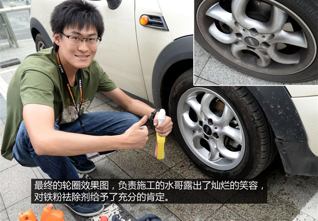 這輛MINI的輪圈不僅有“黑色小點(diǎn)”,還有一大片一大片的黃色污漬。專用輪圈清洗劑這次雖說有了些作用,但小編認(rèn)為對不起它“專用”的名頭。潔廁靈可以清除黃色污漬,但對“黑色小點(diǎn)”仍然束手無策。廚房凈油泡沫在此次清潔過程中依然發(fā)揮了醬油黨的作用。最終的清潔效果很明顯,這次還是被鐵粉祛除劑搶了風(fēng)頭,效果最佳。